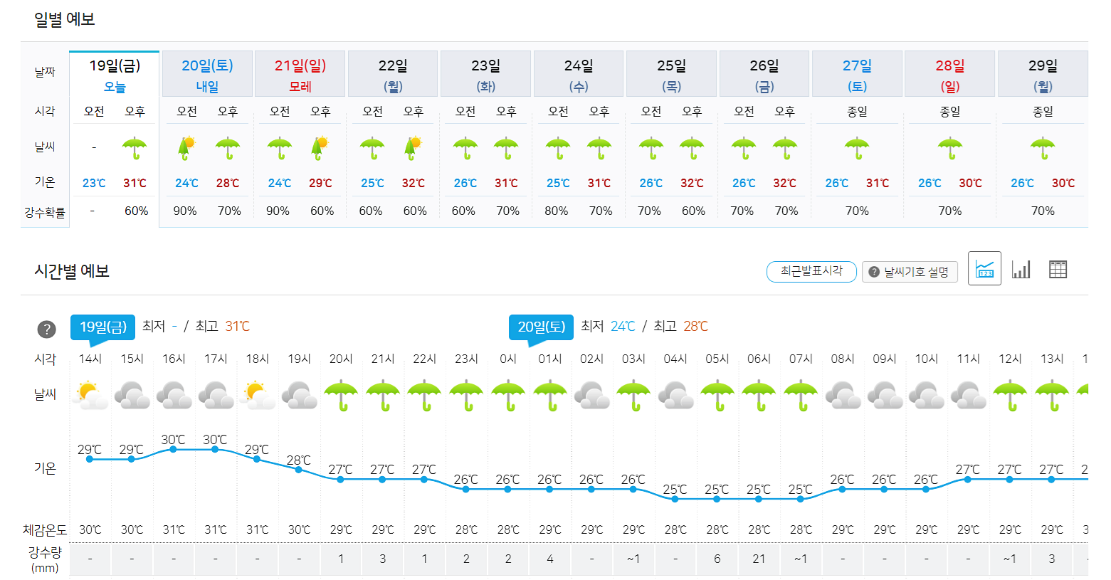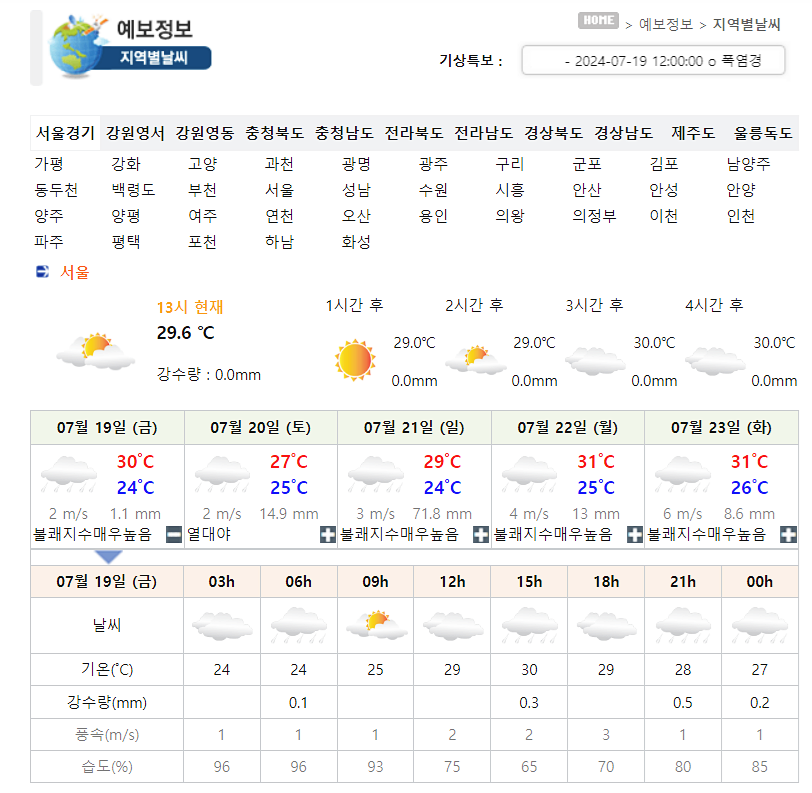 2024년 장마가 이번 주말 21일경 제주도에서 끝이 나고, 남부지방은 24일경, 수도권 및 중부지방은 26일경에 끝날 것으로 보여지고 있습니다. 이번 주 예상 강수일정은 다음과 같습니다. 기온은 평년과 비슷하거나 조금 높을 것으로 예상된다고합니다. 주말부터 다시 더위장마라고 하니 참고하시기 바랍니다.장마는 다음주까지 계속 될 예정이고, 다음주쯤에 끝난다고합니다.