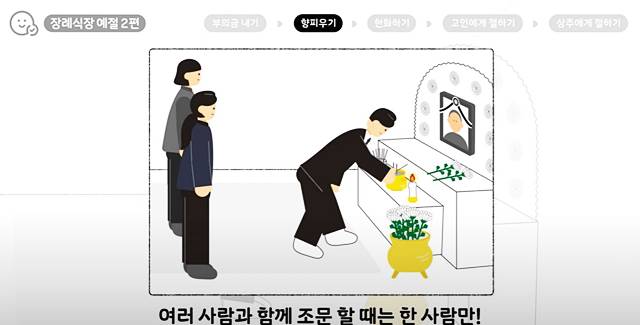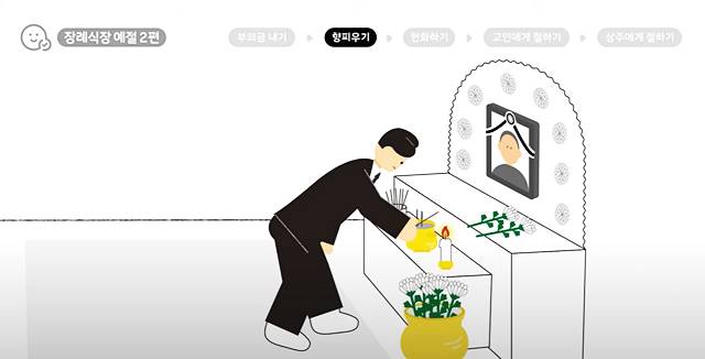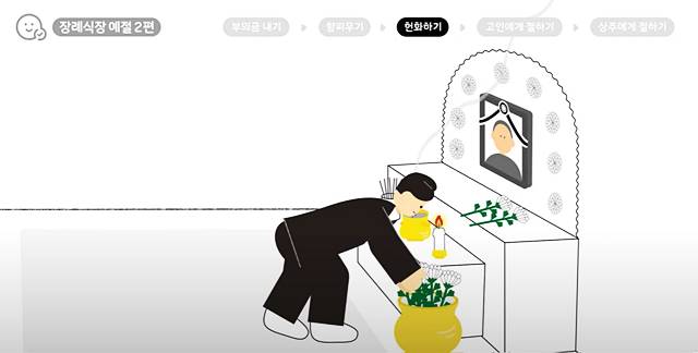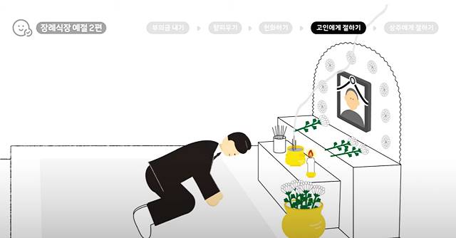 상주나 상제에게 가볍게 목례를 하고, 영정 앞에서는 무릎을 꿇거나 바른 자세로 앉습니다.