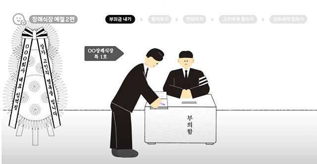 부의록을 작성한 후, 부의금을 부의함에 넣습니다. 빈소에 도착하면 외투나 모자 등은 먼저 벗어 두어야 합니다.