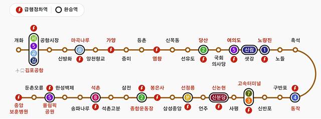 이들 급행 정차역은 각각 중요한 위치적, 사회적 의미를 갖는다. 예를 들어, 여의도역은 금융 중심지로서, 많은 직장인들이 출퇴근하는 주요 거점이다. 고속터미널역은 서울 서부와 남부를 연결하는 교통의 요충지로, 다양한 노선과 연결되어 있다. 이러한 역들이 급행 정차역으로 선정된 것은 단순히 많은 승객을 유치하기 위함이 아니라, 서울의 주요 거점을 빠르게 연결하려는 의도가 담겨 있다.