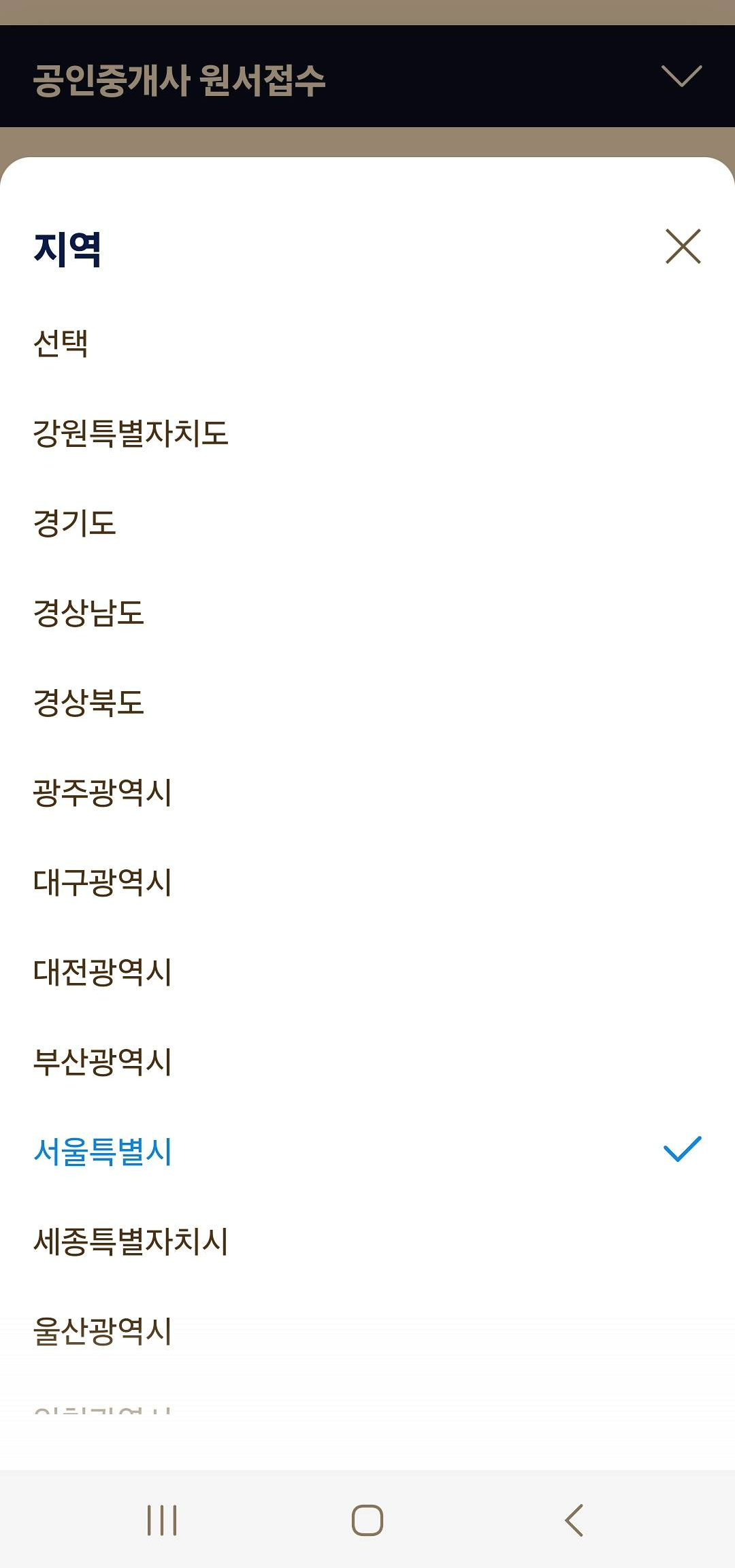 지역 강원특별자치도, 경기도, 경상남도, 경상북도, 광주광역시, 대구 광역시, 부산광역시, 서울특별시, 세종특별자치시, 울산광역시 공인중개사 시험장소를 검색할 수 있습니다. 저는 가족꺼를 대신 접수해주는 중이라 지역을 서울특별시로 했고,