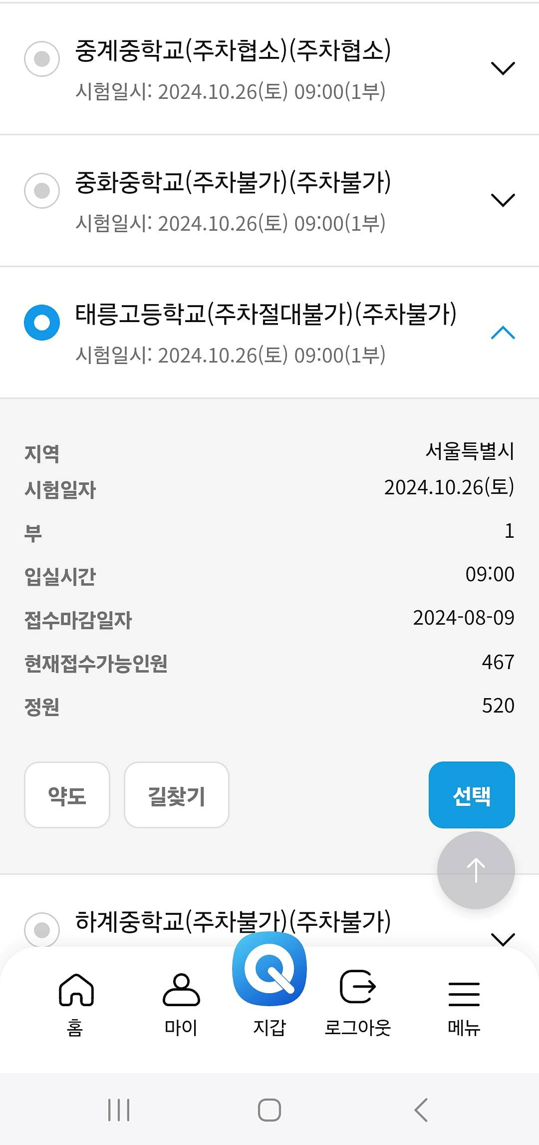 시험장을 누르면 입실시간, 접수마감일자, 현재 가능접수인원, 정원이 나와있습니다.